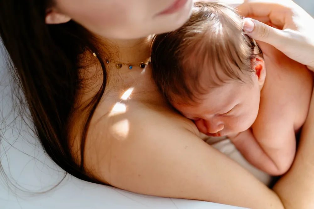 Ngay khi bé chào đời, mẹ nên thực hiện da kề da với bé sớm nhất có thể. Hoạt động này giúp trẻ nhận được nhiều lợi ích như điều hòa thân nhiệt, giảm nguy cơ vàng da, tăng sự gắn kết giữa mẹ và bé, giúp trẻ sớm bú mẹ…[7], [10]